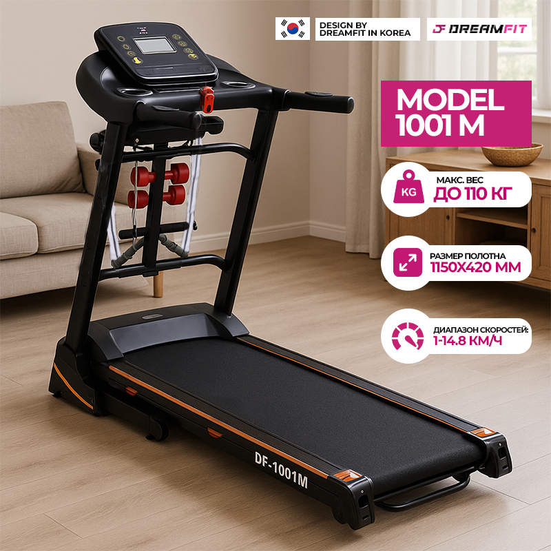 Хотите оставаться в форме, не выходя из дома? Беговая дорожка DF-1001M – идеальный выбор для эффективных тренировок! Благодаря мощному мотору 1.75 HP и скорости до 14.8 км/ч, вы сможете прокачать выносливость и сбросить лишний вес. Регулируемый наклон до 15% поможет имитировать бег в гору для максимального результата. ✅ Просторная беговая поверхность – 115×42 см, комфорт для любого роста ✅ Система Hi-Fi с MP3 входом – тренируйтесь под любимую музыку ✅ LED-дисплей – отслеживайте скорость, дистанцию, пульс и калории ✅ Безопасность на первом месте – защита от аварийной остановки ✅ Бонус! Встроенный массажер, зона для пресса и гантели для комплексных тренировок 🔥 DF-1001M – это ваш путь к идеальной форме прямо у вас дома! Закажите сейчас!