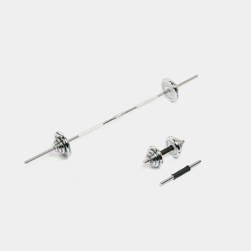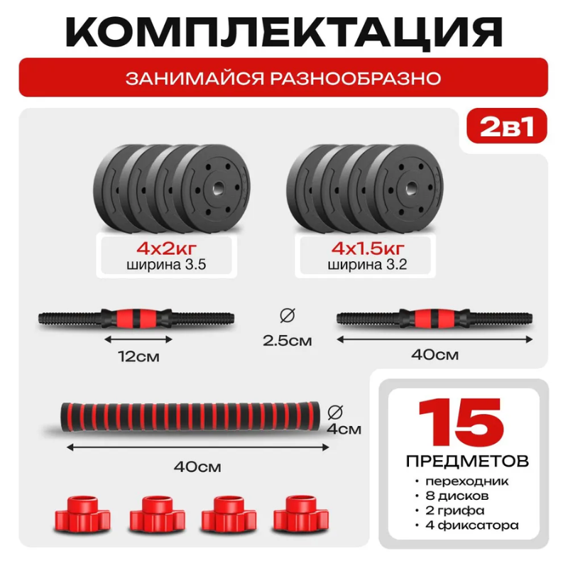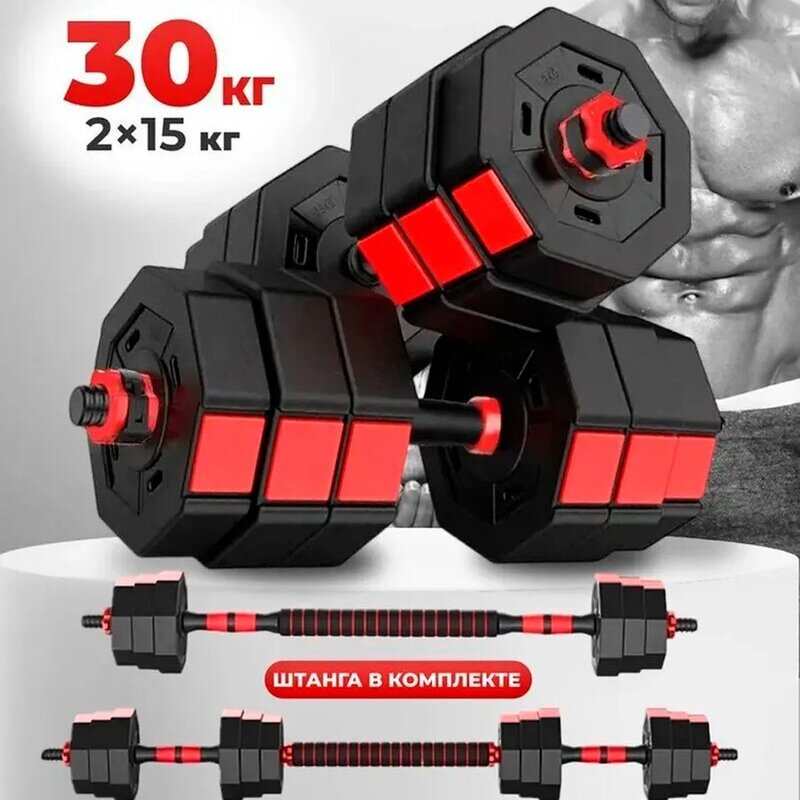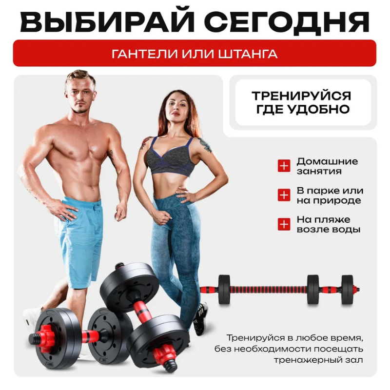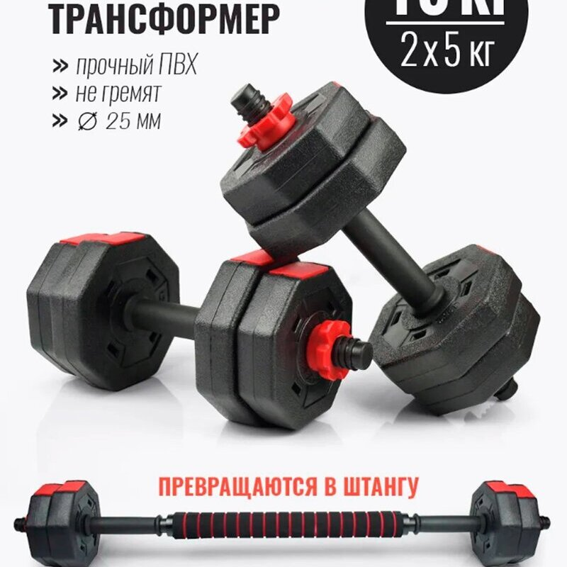 Гантель и штанга 2 в 1 — универсальный набор для дома. Благодаря съёмной соединительной штанге гантели легко превращаются в полноценную штангу, а затем обратно. Идеально для проработки всех групп мышц, экономит место и заменяет целый набор спортивного инвентаря.