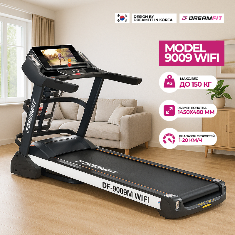 Ваша личная дорога к здоровью и успеху! Беговая дорожка DF-9009M WIFI оснащена мощным DС мотором 4.5 HP, беговой поверхностью 145×58 см и выдерживает нагрузку до 150 кг. Скоростной диапазон от 1 до 20 км/ч и угол наклона до 15% помогут разнообразить тренировки. 15,1-дюймовый LCD дисплей, Android система и Hi-Fi звук создают комфортную атмосферу. Встроенный массажер, возможность тренировки пресса и гантели делают тренировки максимально эффективными. Совместимость с фитнес-приложениями – для умного контроля вашего прогресса!