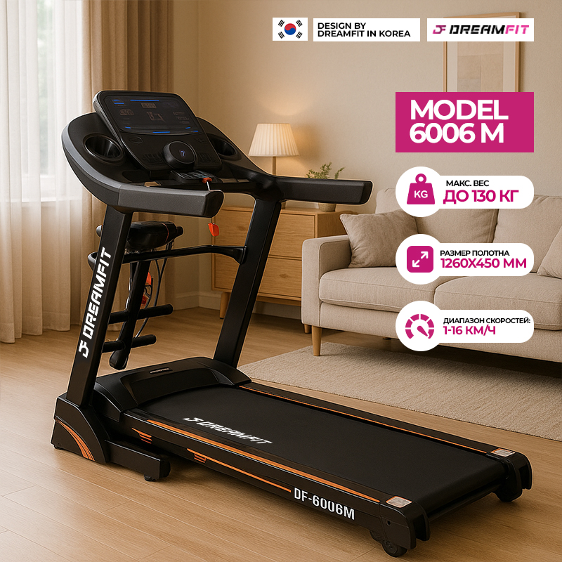 Беговая дорожка DF-6066M создана для комфортных и результативных тренировок дома. Мощный мотор, мягкая амортизация и стильный дизайн делают каждое занятие лёгким и приятным. Следи за скоростью, дистанцией и калориями прямо на встроенном дисплее.