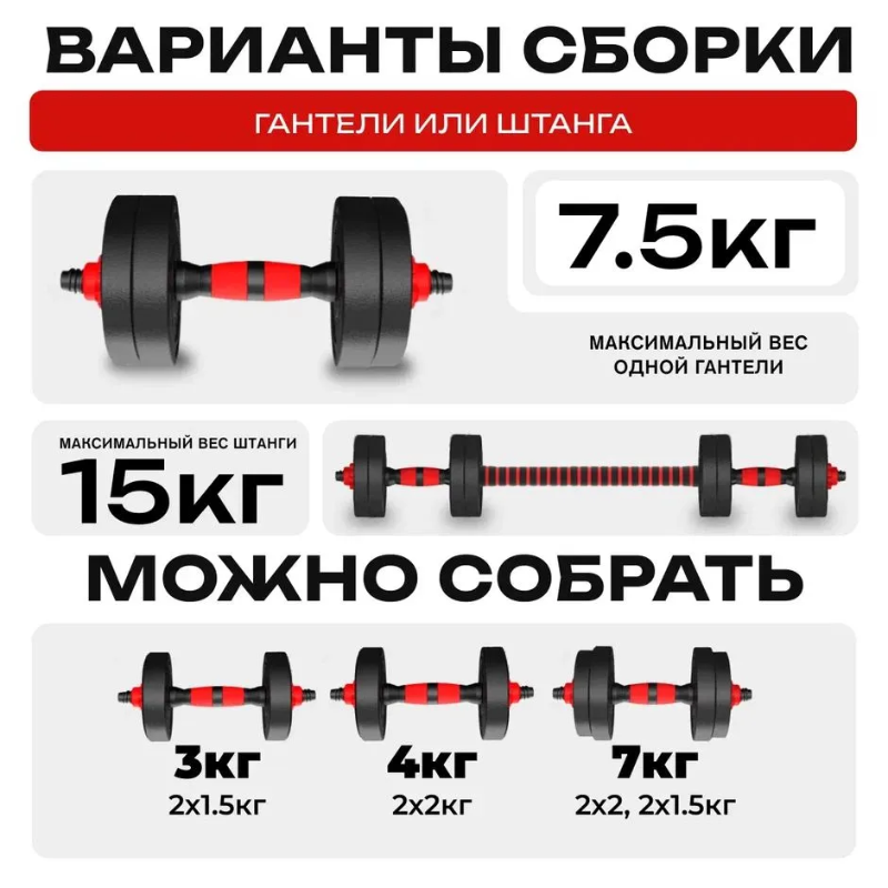 Универсальный набор разборных гантелей для комфортных и эффективных тренировок! В комплекте 2 гантели по 7,5 кг, которые можно регулировать по весу. Надёжная конструкция, нескользящие ручки и удобная система фиксации обеспечивают безопасность и комфорт во время занятий. Отличный выбор как для домашнего, так и для профессионального использования!