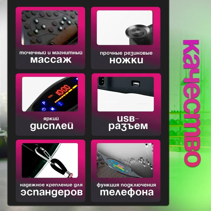 Хотите привести тело в тонус и избавиться от целлюлита? Электрическая виброплатформа – идеальный выбор для домашних тренировок! ✅ Характеристики: ✔ Тип: Виброплатформа ✔ Максимальный вес пользователя: 150 кг ✔ Производство: Китай ✔ Воздействие на мышцы: Грудь, ноги, пресс, руки, спина, ягодицы 💪 Укрепите мышцы, улучшите кровообращение и ускорьте жиросжигание с помощью виброплатформы!