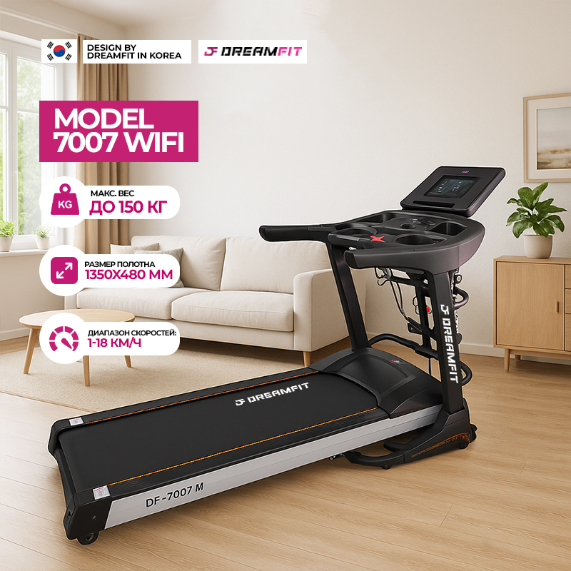 Самая передовая фитнес-технология – умная беговая дорожка Модель DF-7007M WIFI Макс. вес пользователя 150 кг – трасса рассчитана на каждого. Беговая поверхность: 135х48 см – больше места для занятий. Двигатель постоянного тока: 4,5 л.с. — мощный двигатель для безграничных возможностей. Диапазон скоростей: 1-18 км/ч — темп выбирайте сами. Диапазон наклона: 15% – имитация различных упражнений. Hi-Fi система; Аудиовход MP3 — музыка, которая приведет вас к успеху. Функция защиты от аварийной остановки: безопасность превыше всего. 10-дюймовый TFT-дисплей — вся необходимая информация на виду. Массаж, пресс, гантели – разнообразьте свои тренировки. Полноценная система Android, всегда подключенная к миру фитнеса. Готовы ли вы измениться? Это не просто беговая дорожка. Это ваш личный тренер, ваш навигатор в мире здоровья и образа жизни. Добро пожаловать в будущее фитнеса с DF-7007M WIFI!