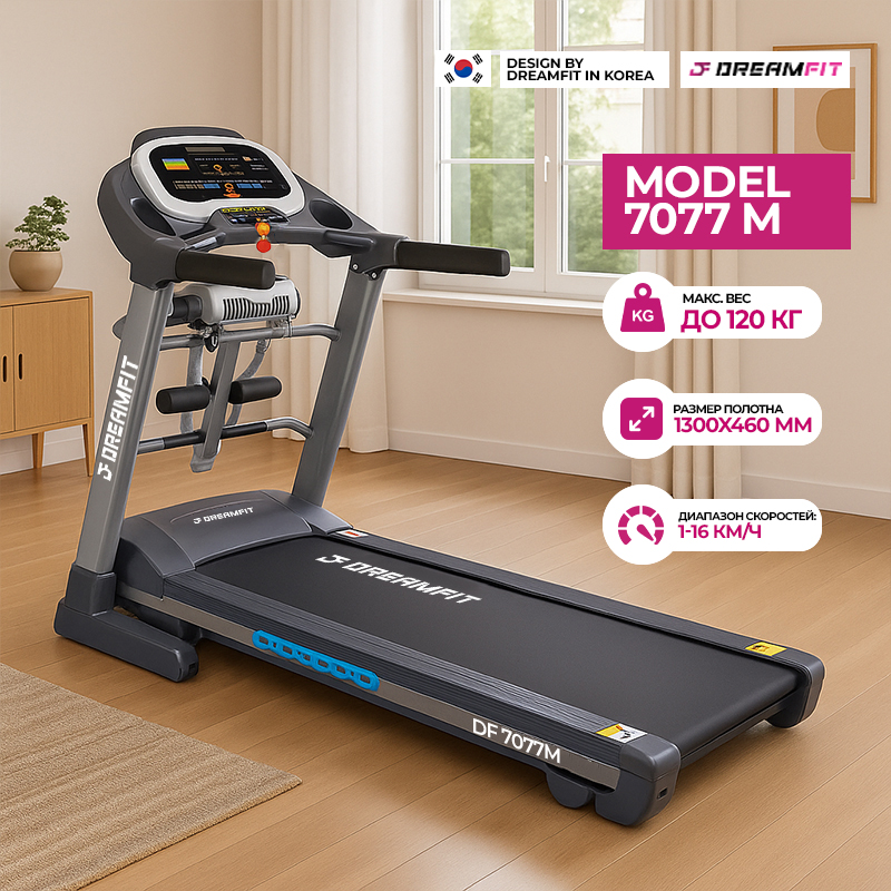 Новый ритм, новые возможности, новый вас! Представляем вам беговую дорожку Модель-DF-7077M от Dreamfit - уникальное сочетание инноваций и комфорта, чтобы каждая ваша тренировка стала настоящим моментом трансформации! Позвольте себе погрузиться в мир бесконечных возможностей с максимальным весом пользователя до 120 кг. Независимо от ваших целей и начального уровня подготовки, эта дорожка примет вас с открытыми объятиями. Удивительная беговая поверхность 130x46 см создана, чтобы ваши шаги были свободными, естественными и полными энергии. Двигайтесь, как будто вы стоите на своей тренировочной арене! Мощный DС мотор 2,5 HP позволит вам перенести границы своей выносливости. От скорости 1 км/ч до увлекательных 16 км/ч - каждая сессия на этой дорожке становится вашим персональным вызовом. Покорите виртуальные вершины с диапазоном наклона от 0 до 16%. Пусть каждый наклон будет шагом к вашей фитнес-цели, а каждый спуск - шансом отпустить напряжение. Функции защиты от аварийной остановки обеспечат вашу безопасность в каждой тренировке. Доверьте эту заботу дорожке, и пусть вы полностью сконцентрируетесь на своих достижениях. Восхитительная Hi-Fi система с MP3 аудио входом и USB портом позволит вам настроить атмосферу тренировки и окунуться в мир музыки, который вдохновит вас на большие победы. Информационный LCD дисплей диагональю 7 дюймов - ваш главный спутник в пути к фитнесу. Отображение скорости, наклона, времени, расстояния, калорий и пульса руки поможет вам контролировать каждый шаг к успеху. Дорогие друзья, ваше фитнес-путешествие начинается здесь, с Dreamfit Модель-DF-7077M. Сделайте первый шаг к лучшей версии себя и дайте вашим мечтам взлететь выше, чем когда-либо!